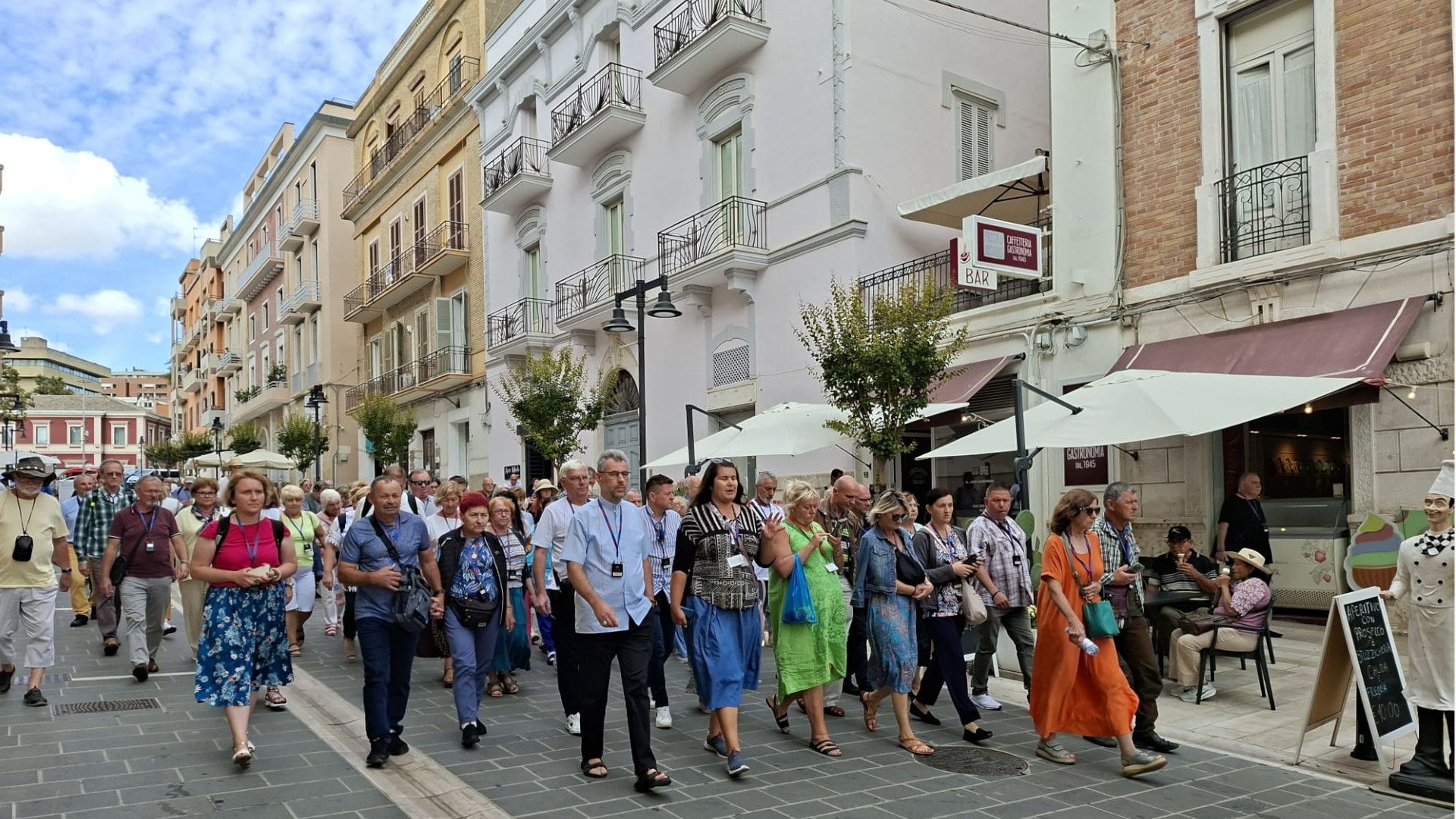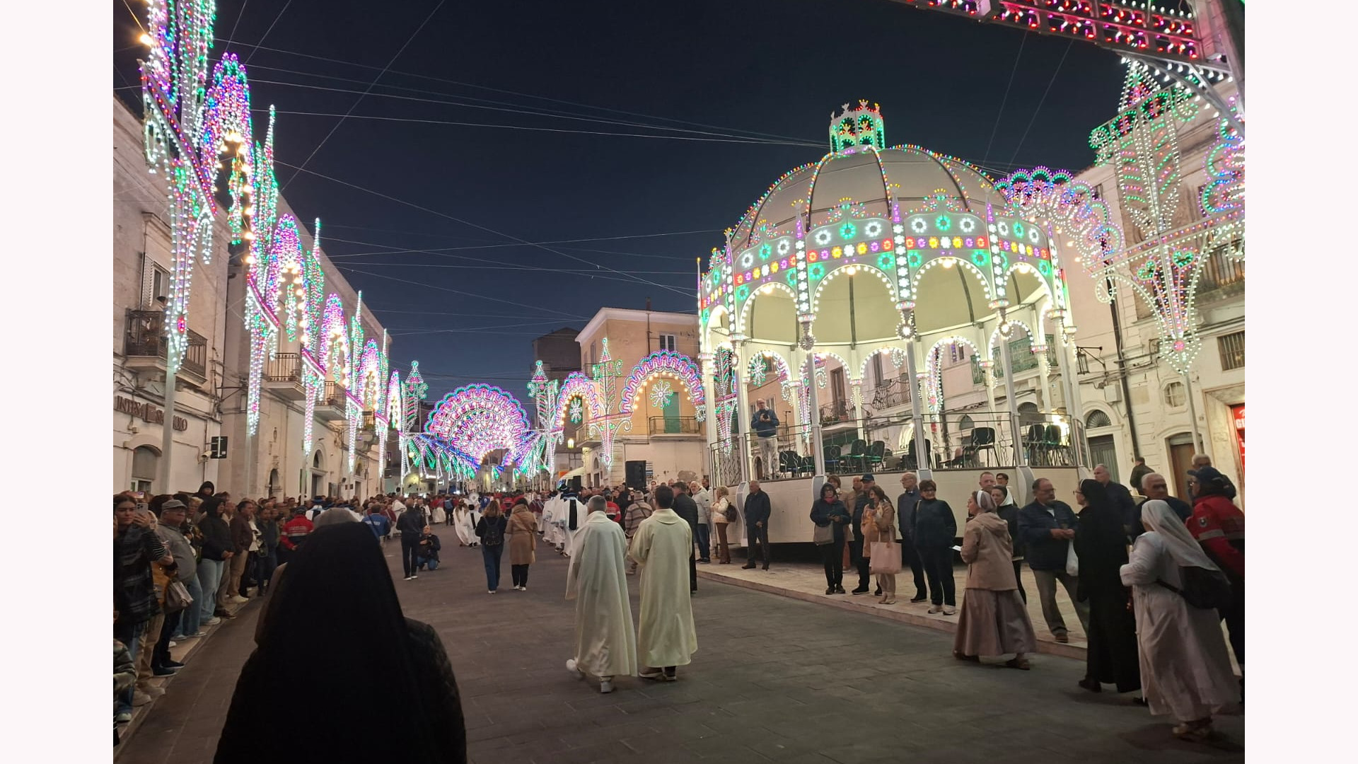 O godzinie 16:00 rozpoczęło się oczekiwane przez wszystkich nabożeństwo do św. Michała Archanioła, zakończone kilkugodzinną procesją wokół uliczek Monte Sant’Angelo z figurą i mieczem św. Michała Archanioła. Mieszkańcy i pielgrzymi, ubrani odświętnie, podążali za Archaniołem, powierzając swoje intencje i dziękując za opiekę. Szczególnym zwyczajem jest tutaj przebieranie chłopców za „małych Michałków” – idą oni w procesji w białych tunikach, z tarczami i mieczami, co symbolizuje czystość i gotowość do walki duchowej. Uczestnictwo w tej procesji to nie tylko podtrzymanie tradycji, ale głębokie duchowe doświadczenie, w którym można poczuć obecność Archanioła — obrońcy Kościoła i dusz ludzkich.